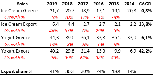 As you can see, in 2019 exports were already 41% of revenue. Yogurt exports, the growth driver, is already 36% of total revenue. The yogurt division (Greece + Export) is 75% of sales.