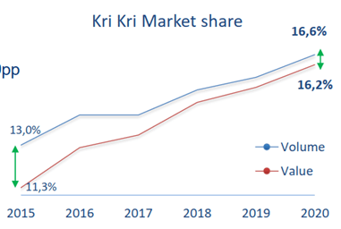 Looking through the company presentations we can see that in terms of volume, they have gone from 4% market share in 2008 to 16,6% market share in 2020. I think this is very remarkable taking into account that Kri Kri started its yogurt production in the 90’s. I looked into the competitors websites and found that Fage, Vivartia (Delta) and Mevgal started their yogurt operations in 1964, 1994 and 1974, respectively.