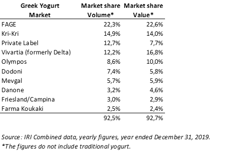 - Largest producer of yogurt in Greece: 25% market share by volume (branded + private label). They have 70 – 80% market share in private label. Market share in branded yogurt (volume) has gone from 4% in 2008 to 16,6% in 2020.