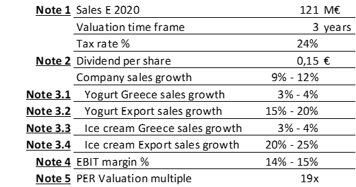 Note 5: As we see in the table below, the peer group trades at 21x. For this reason I consider that choosing 19x valuation multiple for Kri Kri is reasonable. Perhaps, one could consider that since is a tiny company compared to these mega giants, it deserves an even lower multiple. Well, I already put a lower multiple for this reason, but we have to consider that these big companies are essentially not growing and, with the exception of Emmi, all have much higher levels of debt than Kri Kri. Actually Kri Kri, has no debt.