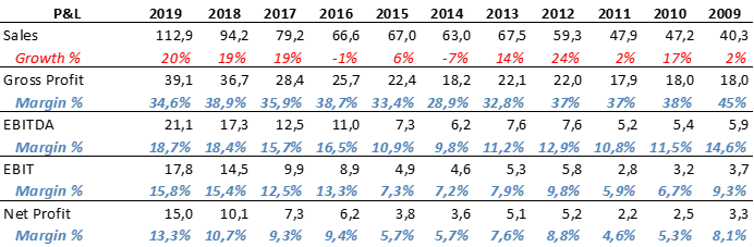 The company was listed on the Athens Stock Exchange in 2003. Since then, sales have grown at a compounded annual growth rate (CAGR) of 13,4%. From 19,5M€ in 2003 to 113M€ in 2019.